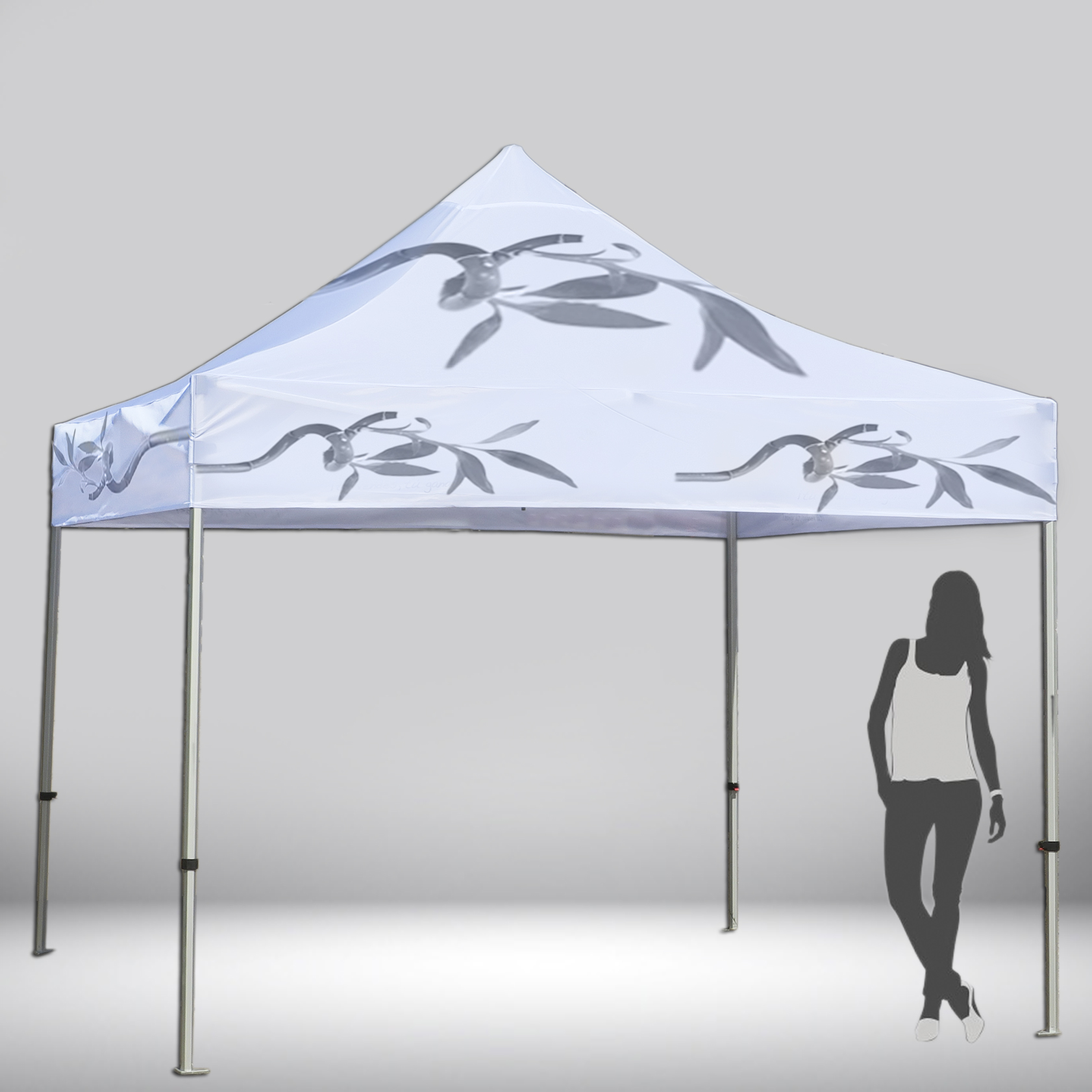 Carpa plegable de 3×3 metros. Incluye estructura de aluminio y techo con faldón confeccionado en tela de 115 gr/m2 y 280gr/m2 para tela impermeable. Diseño del techo y faldón personalizables.